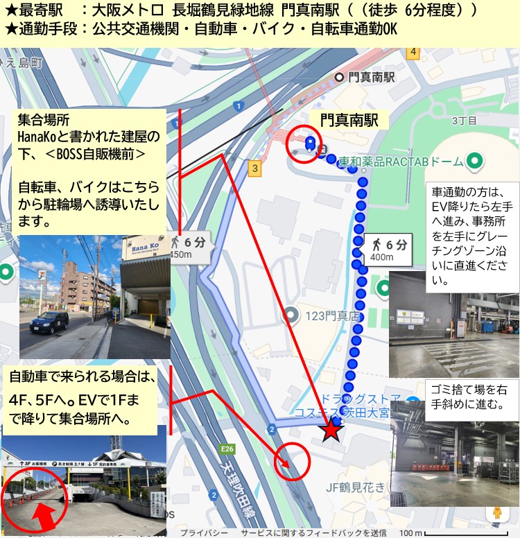 | 最寄駅 | 大阪メトロ 長堀鶴見緑地線 門真南駅 就業時刻が終電時刻 の為、自転車、バイク、 自動車通勤が望まし いです。 |